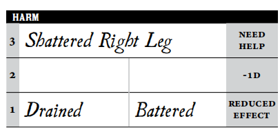 如果你需要记录伤害等级,但这一行已被填满,那伤害就要移动到更上方一行。比如,如果你遭受了中度伤害(2级),但第二行已经没有空位,那就必须记为严重伤害(3级)。如果顶行被填满了,但仍然需要在这里记录伤害的话,你的角色就会遭受灾难性的永久后果(断肢、猝死等,根据具体情况而定)。